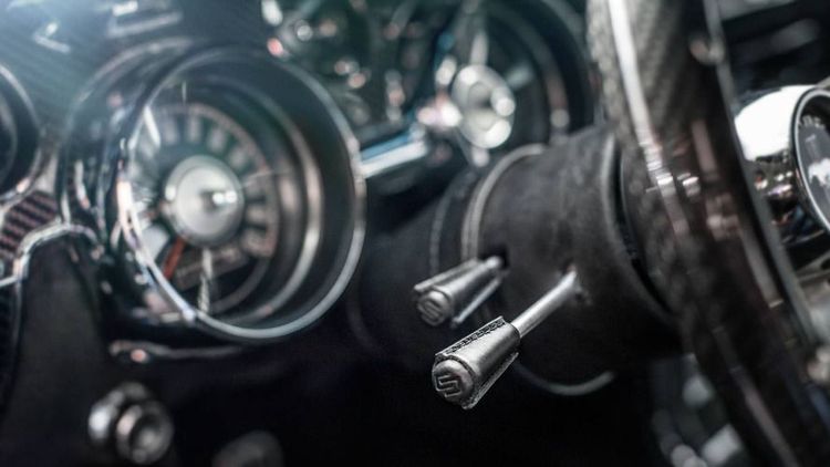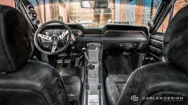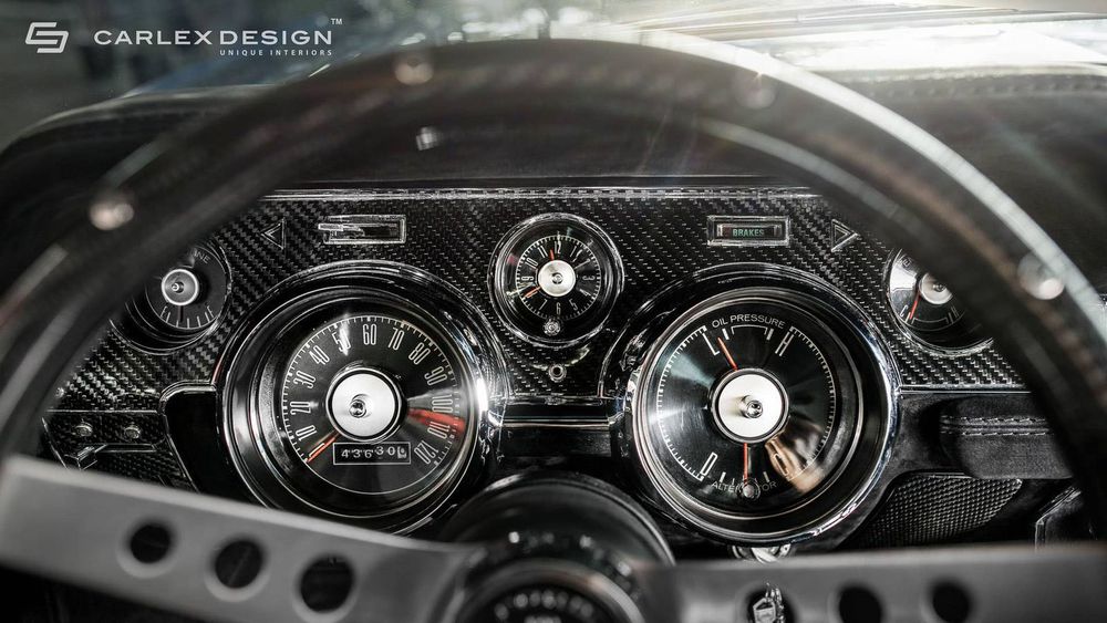 Carlex Design conserve les meilleures pièces de cette Ford Mustang Fastback comme le volant trois branches, mais les mises à jour majeures abondent ailleurs. Carlex utilise la fibre de carbone pour la majeure partie de la garniture, y compris sur le tableau de bord et le bas du tunnel central. Le Cuir Nubuck noir remplace la sellerie d'origine avec une finition légèrement dépareillée afin de donner du sens à l'âge de la voiture. Pour éviter d'obtenir un intérieur trop sombre dû au carbone, le préparateur a installé une combinaison d'argent et quelques raccords de chrome.